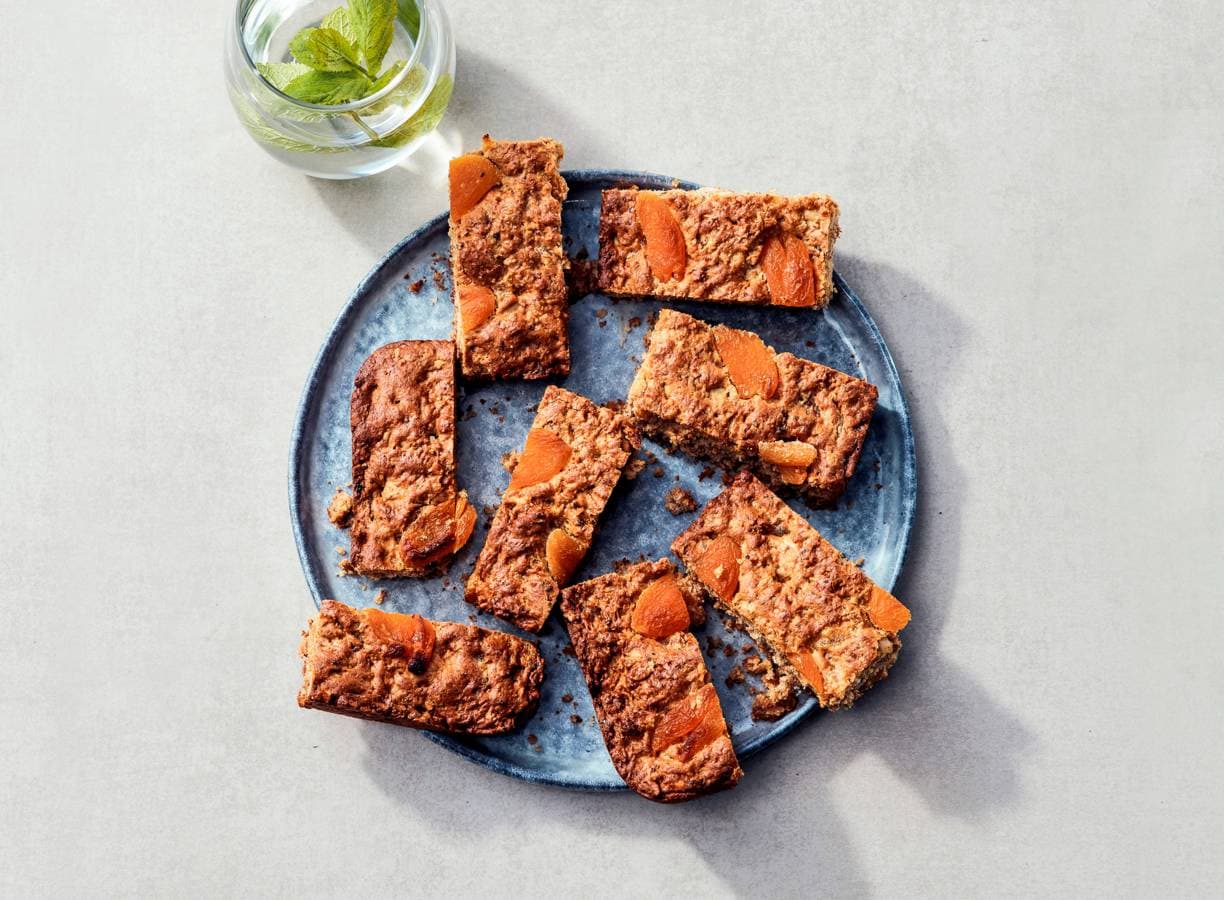 Bekleed de vorm met bakpapier en verdeel het mengsel gelijkmatig erover. Verdeel de abrikozen over de bovenkant en druk iets in. Bak ca. 20 min. in het midden van de oven. Laat in ca. 1 uur helemaal afkoelen. Snijd in 14 stukken en bewaar in een afgesloten trommel.