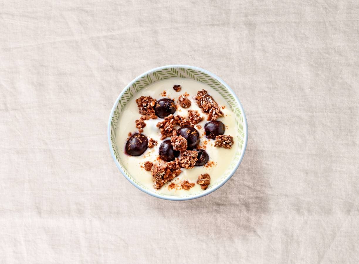 De kers op je ontbijt, deze vegan breakfastbowl met kersen en muesli.