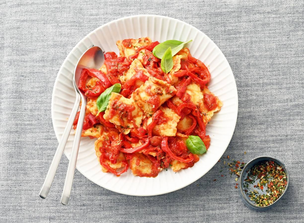 Maar 5 ingrediënten nodig: ravioli in paprika-tomatensaus met basilicum. Lekker makkelijk toch? Deze makkelijk pasta staat al in een halfuurtje op tafel.