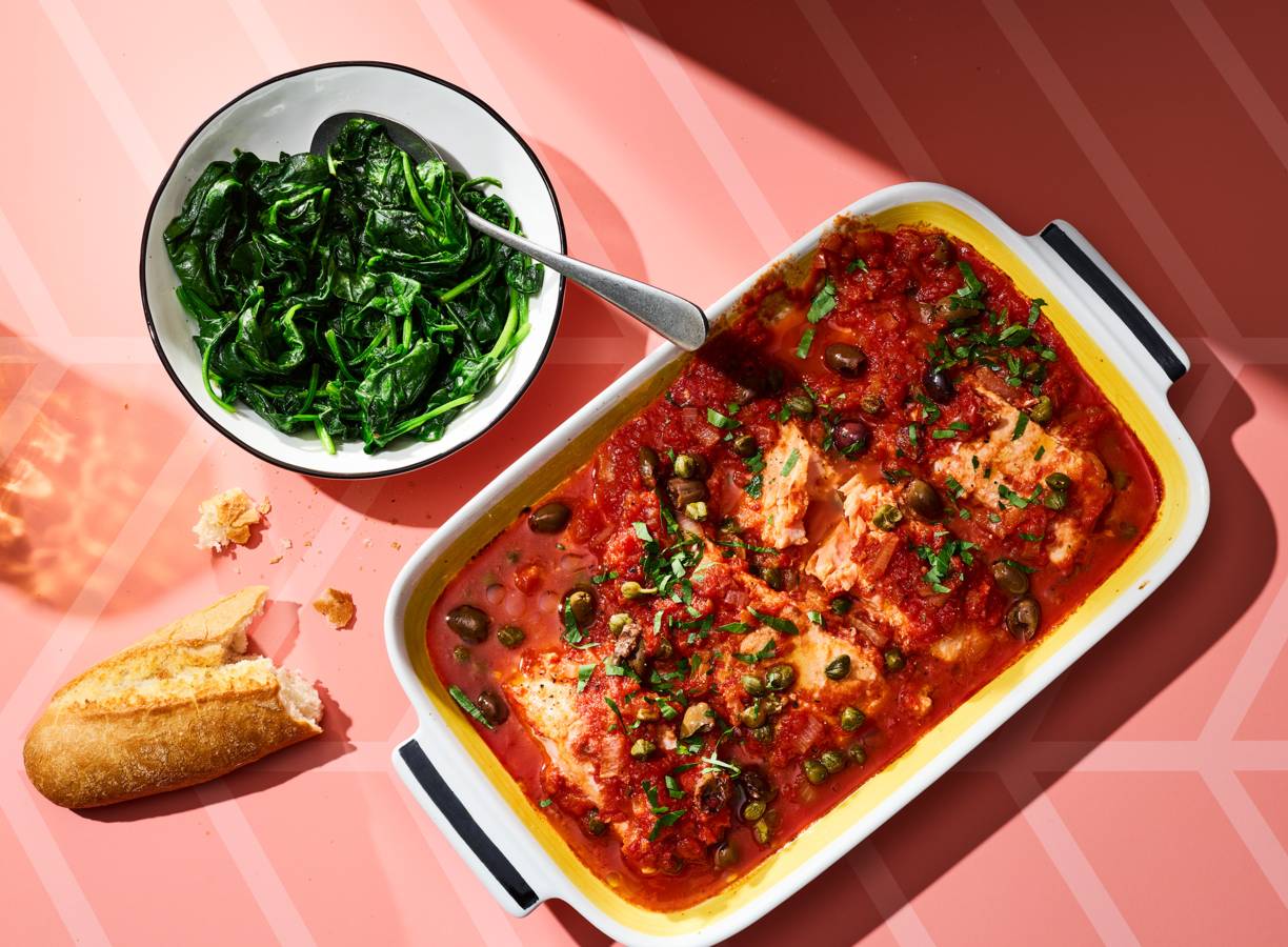 Deze zalm ovenschotel is geïnspireerd op de populaire puttanesca pasta, met tomaat, olijven, ansjovis en kappertjes. Heerlijk met pasta of stokbrood, maar ook gewoon zo!