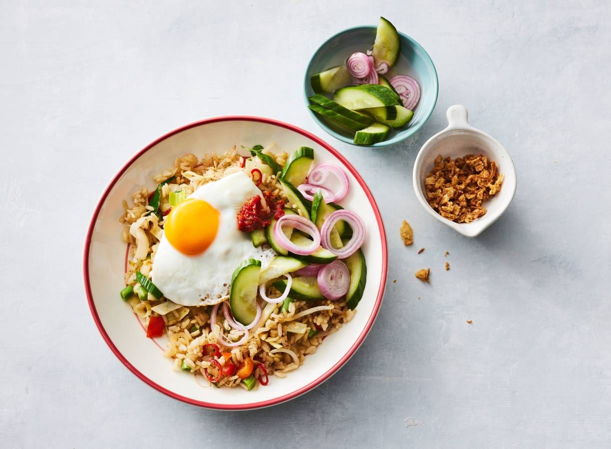 Ga voor gebakken rijst. Zeker in deze combinatie met komkommer in het zuur.