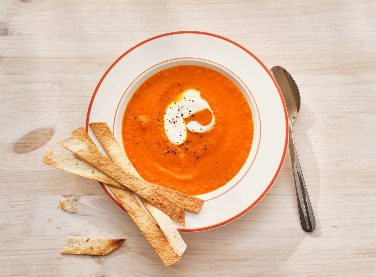 Paprikasoep met tomaat en knapperige tortillareepjes