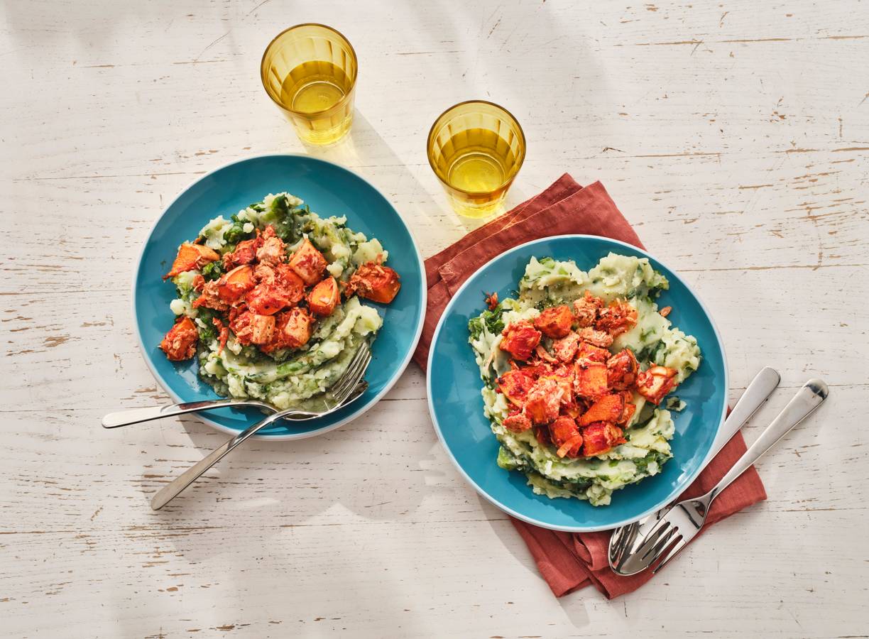 Andijviestamppot met geroosterde pompoen en tonijn