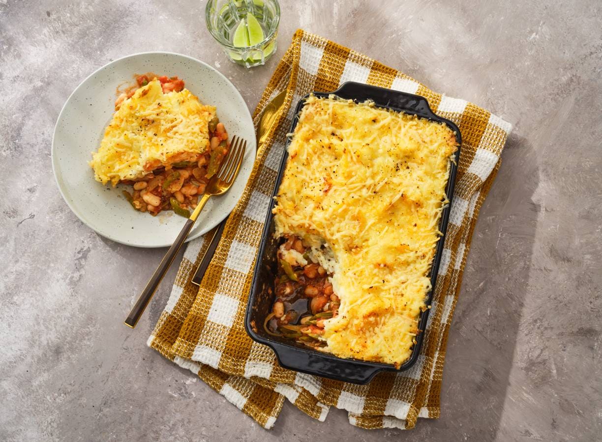 Witte bonen in tomatensaus? Ja, en in een ovenschotel! Samen met snijbonen, aardappelpuree en natuurlijk kaas. Klaar is je vegetarische bonenschotel.