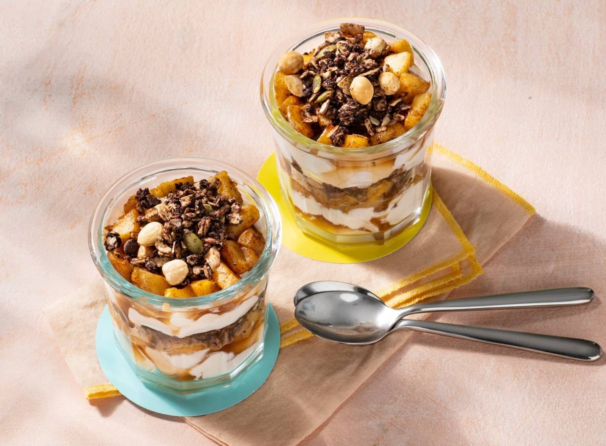 2. Verdeel achtereenvolgens de helft van de skyr, de helft van de appel en de helft van de granola over glazen. Herhaal deze stap met de rest van de skyr, appel en granola en serveer.