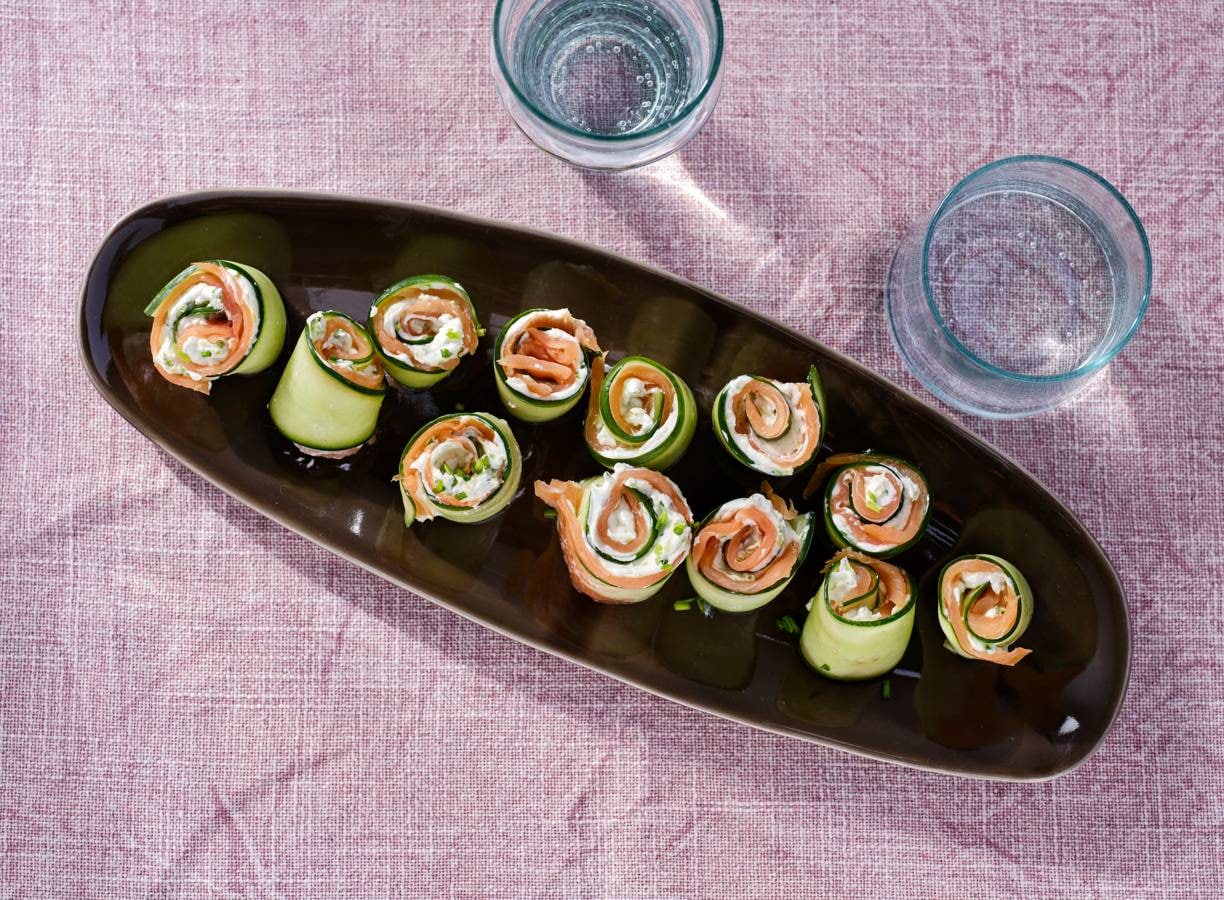 Leg een plak komkommer op het werkblad, besmeer met een dunne laag roomkaas en leg er een plak zalm op. Besmeer de zalm ook met een dunne laag roomkaas. Rol de komkommer voorzichtig op. Herhaal met de rest van de komkommer, zalm en roomkaas.