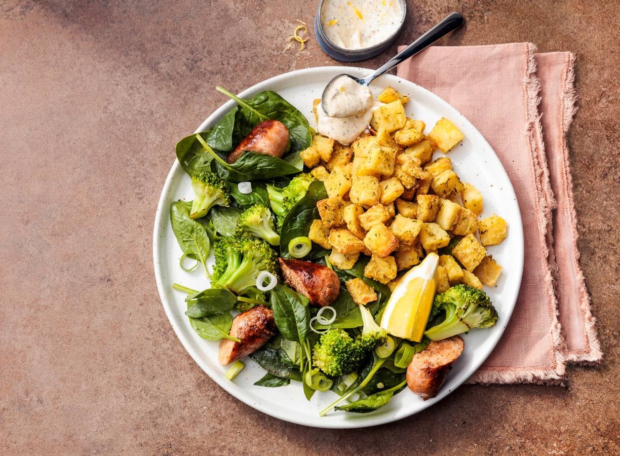 AVG'tje maar dan spannender: aardappelblokjes met een krokant kruidenkorstje, Catalaanse braadworstjes en spinazie.