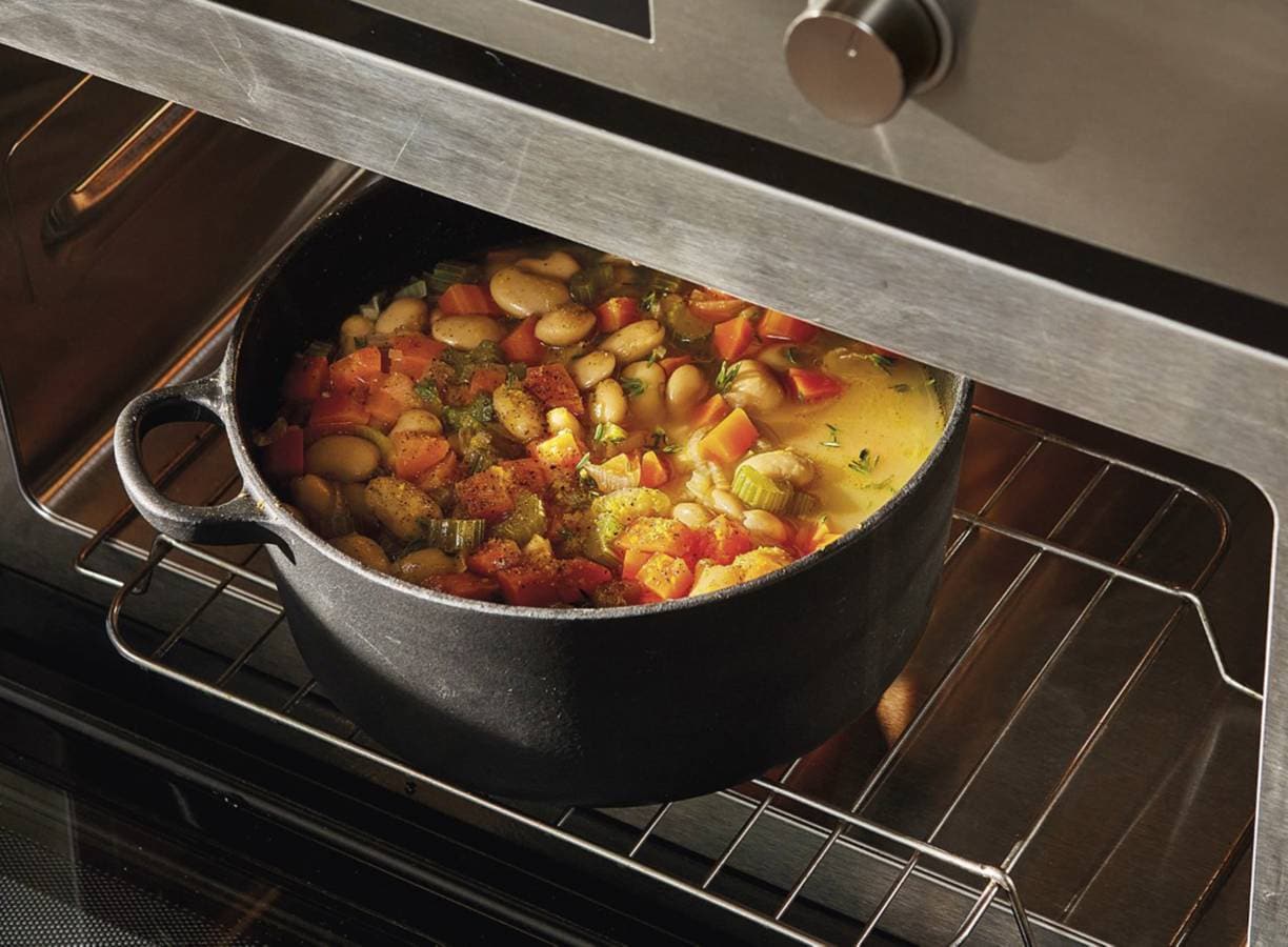 Voeg de bonen en tijmblaadjes toe aan de pan en schep om. Giet er 400 ml water (per 4 personen) bij en breng de stoof op hoog vuur aan de kook. Leg de deksel op de pan en zet ca. 15 min. in de oven.
