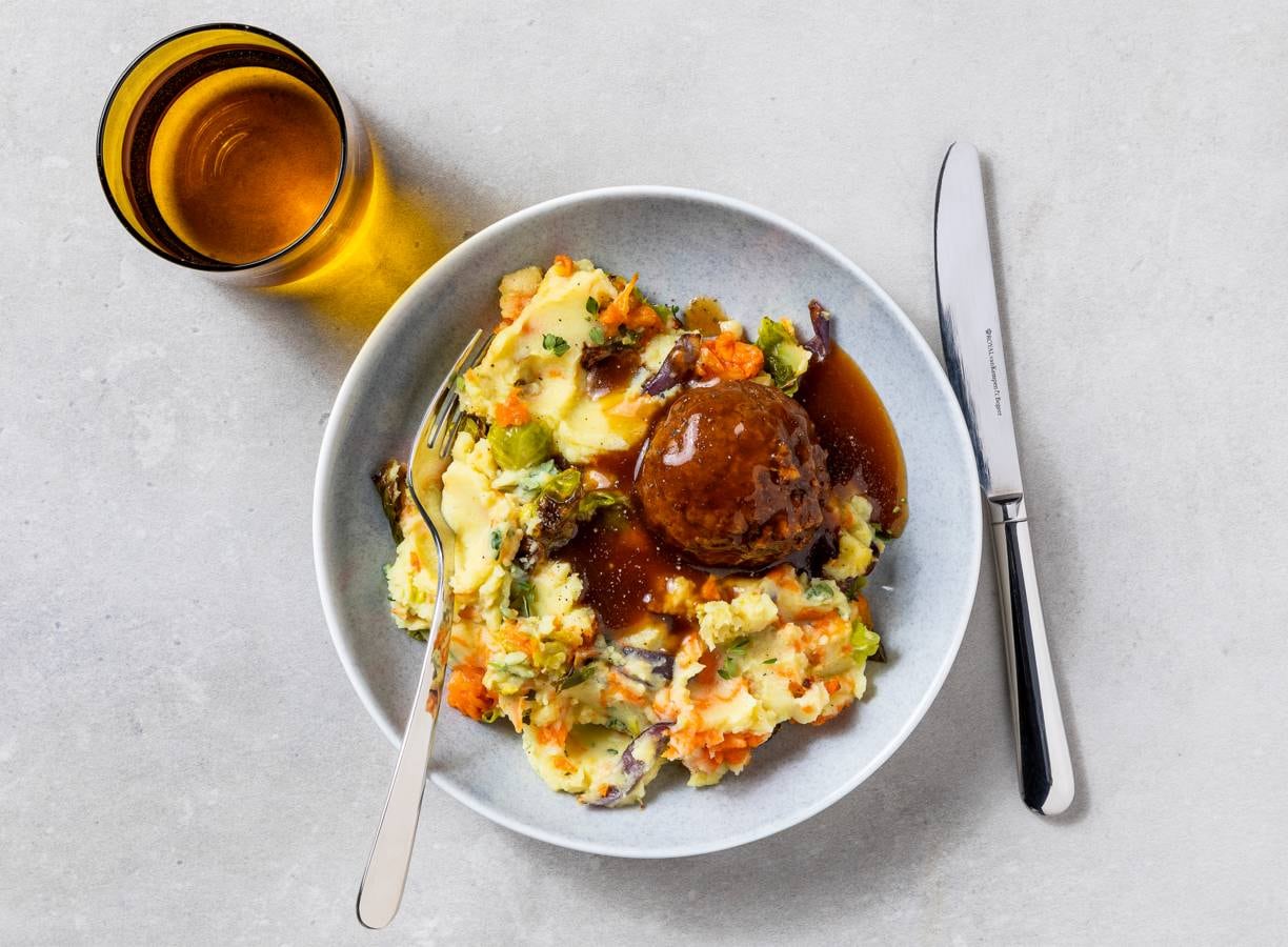 Herfststamppot met spruitjes, pompoen en gehaktbal