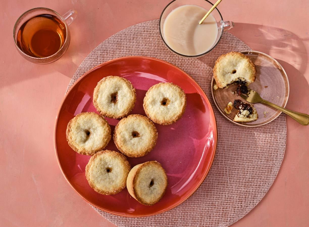 Verwarm de oven voor op 190 °C. Rol ⅔ van het deeg op een met bloem bestoven werkvlak uit tot een lap van ca. 3 mm dik. Steek er met een uitsteekvorm cirkels uit van ca. Ø 9 cm, afhankelijk van de doorsnede van de holtes in de muffinvorm. Leg de cirkels in de holtes van de muffinvorm en druk voorzichtig aan. Vul de deegbodems met mincemeat, tot 1 cm onder de rand van het deeg. Zet de vorm tot gebruik in de koelkast.