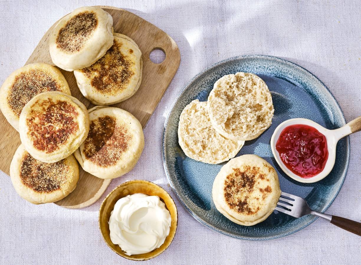 English muffins, een soort brood- of scone-achtige broodjes, zijn lekker met een gebakken ei, kaas of met boter en jam.
