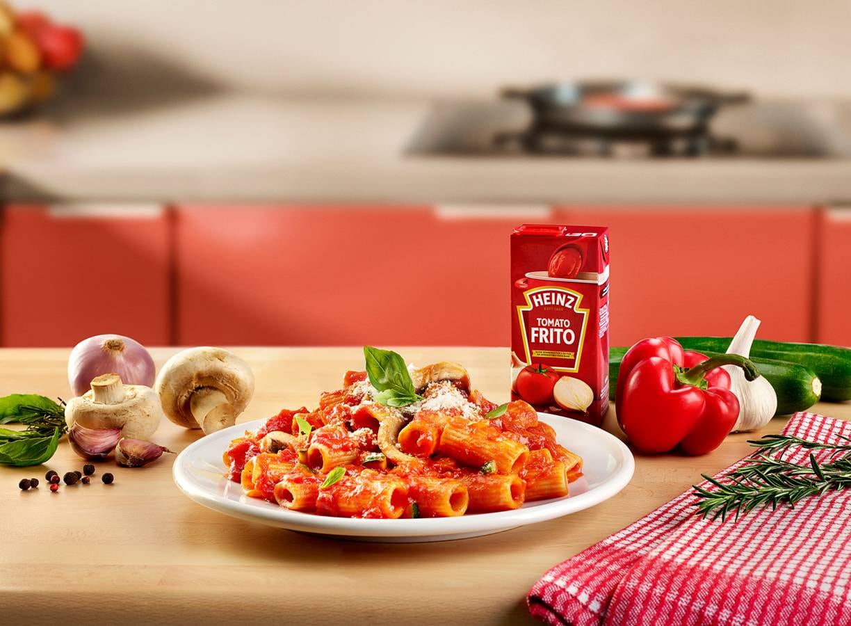 Koken met Heinz: Rigatoni pasta met Heinz Tomato Frito en heerlijke verse groenten.