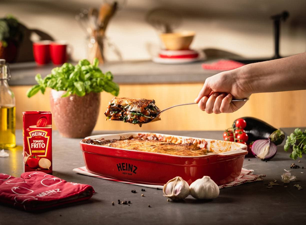 Koken met Heinz: een overheerlijk Italiaans gerecht van laagjes gegrilde aubergine, tomatensaus, mozzarella en Parmezaanse kaas.