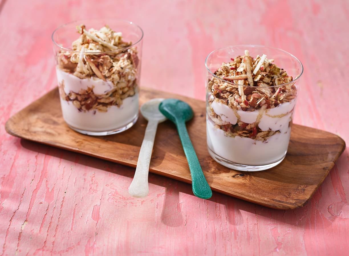 Verdeel achtereenvolgens de helft van de yoghurt, de helft van de geraspte appel, de rest van de yoghurt en de rest van de appel over hoge glazen.