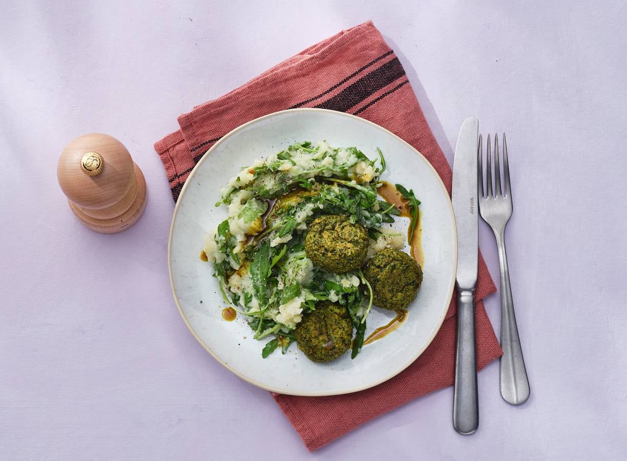 Knolselderijstamppot met rucola en spinazie-tofu balletjes