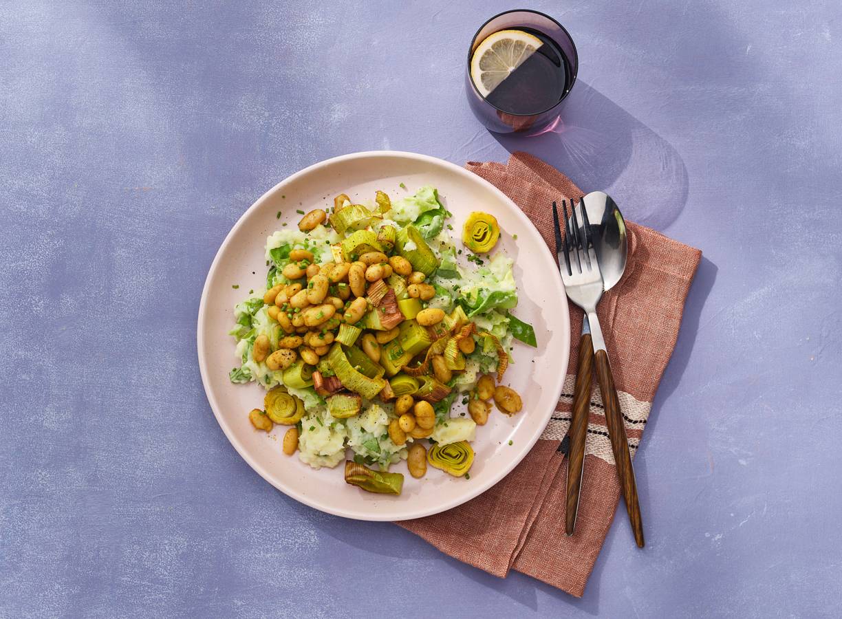 Deze stamppot heeft alles wat je wil: geroosterde prei en gebakken bonen, sla, kerrie en bieslook. Kortom: de perfecte combi.