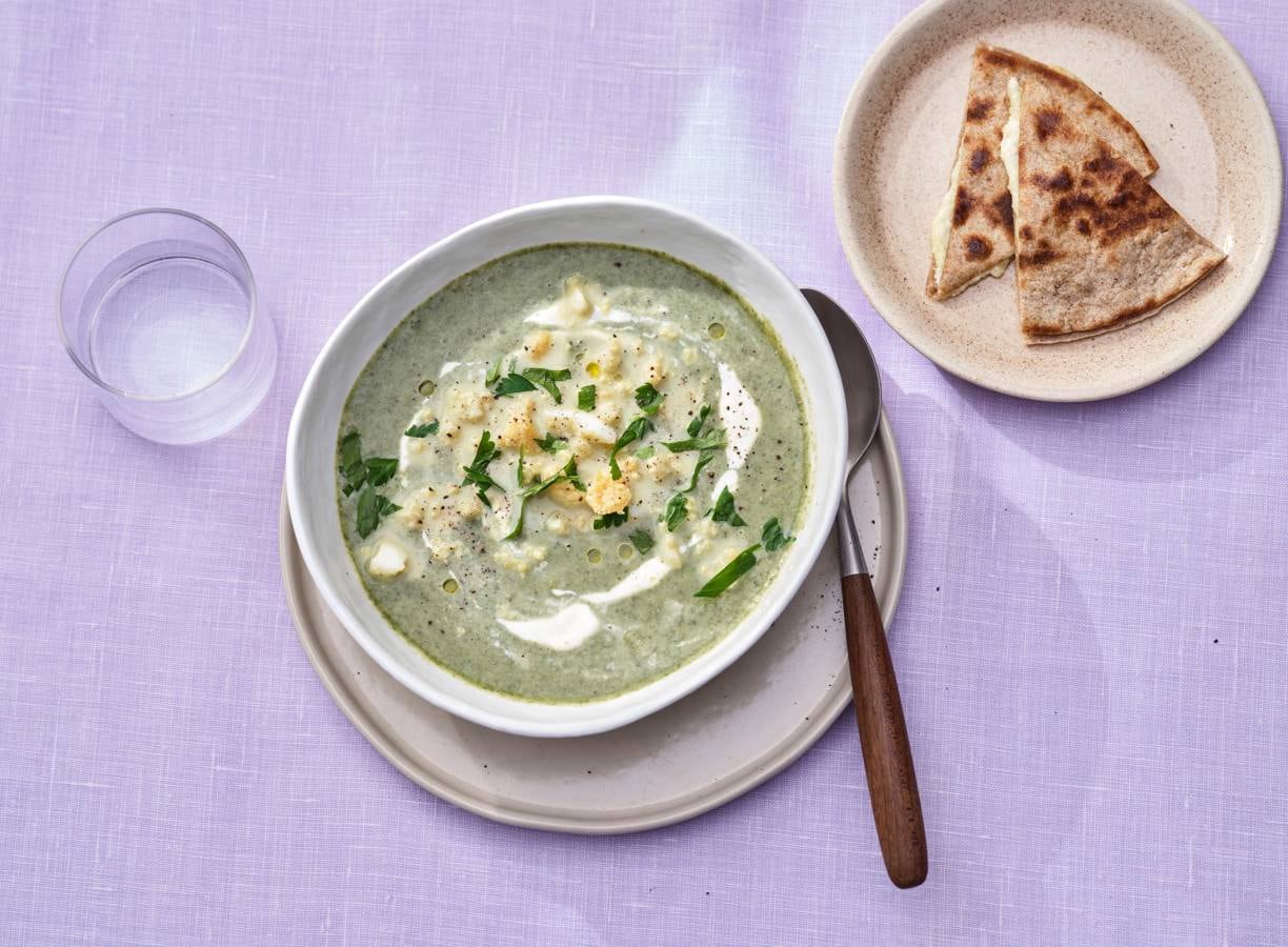 Groen, groener, groenst. Wat een prachtige kleur heeft deze spinaziesoep! Je maakt het feest compleet met een topping van eikruim en een snelle quesadilla. Dippen maar!