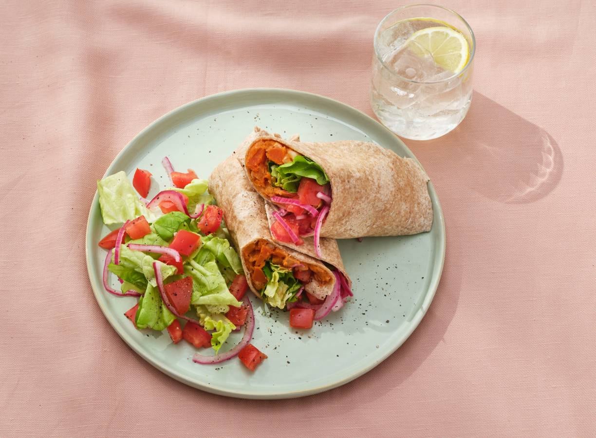 Burrito met witte-bonenspread, tomaat en gemarineerde rode ui