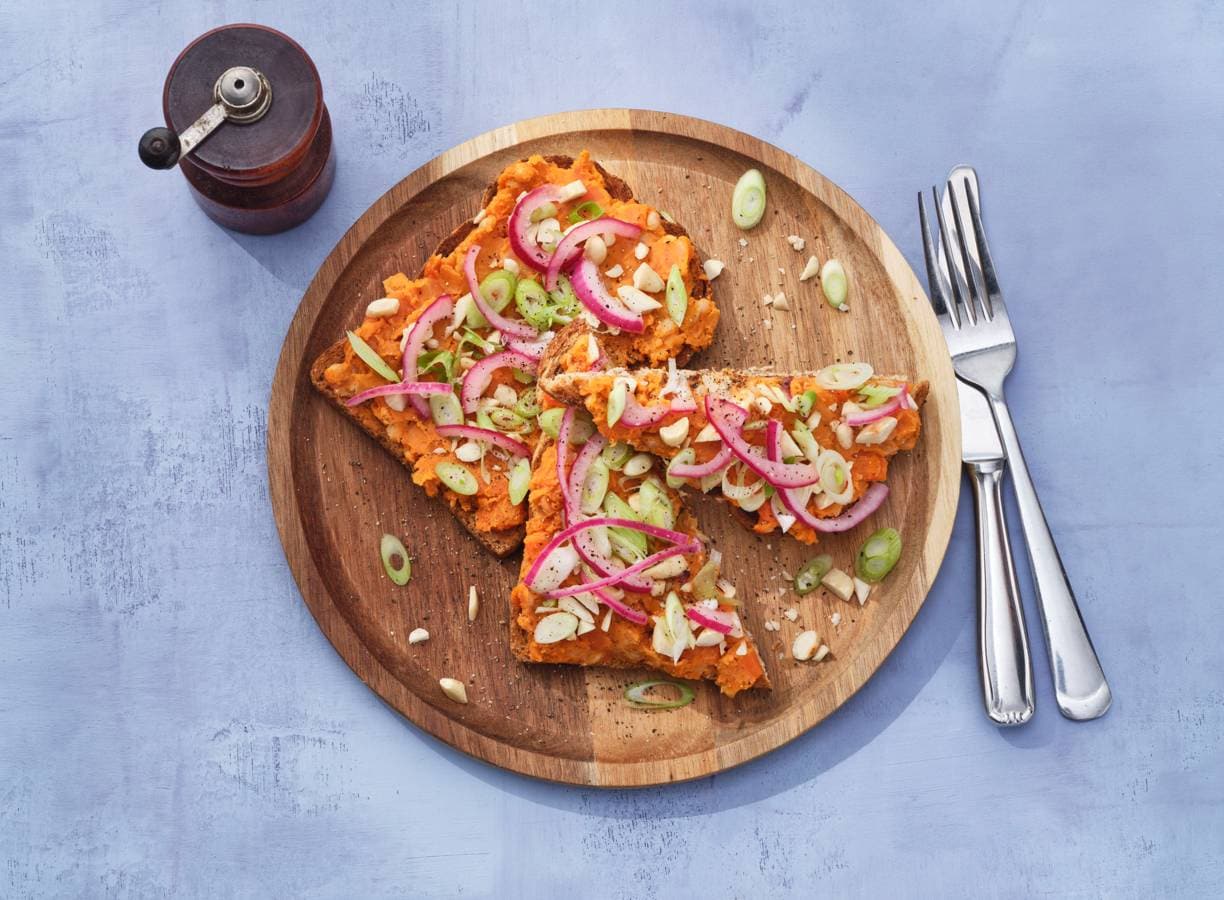 De snelste lunch maak je natuurlijk met restjes. Daarom gaan de witte bonenspread en de ingelegde rode ui van de avond ervoor op toast.