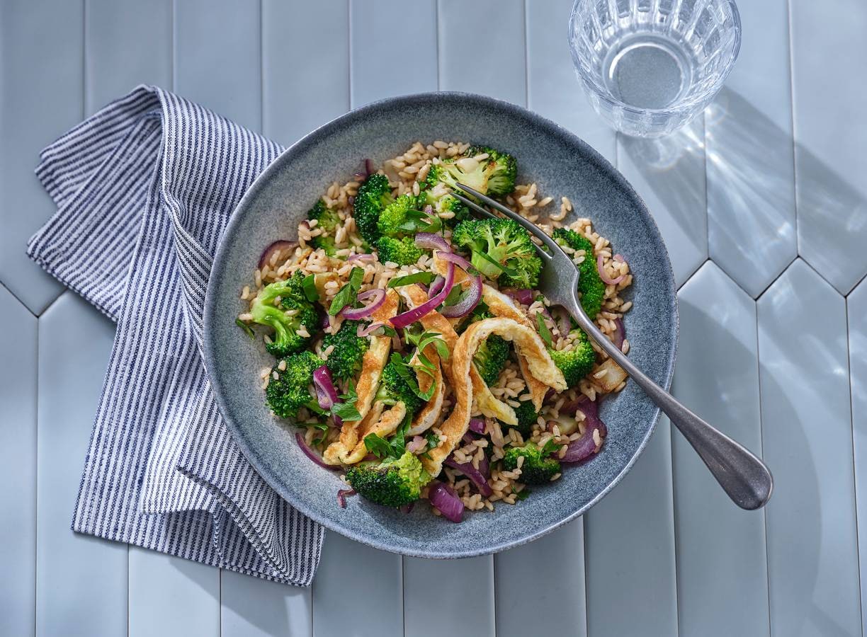 Gebakken zilvervliesrijst met broccoli en omeletreepjes