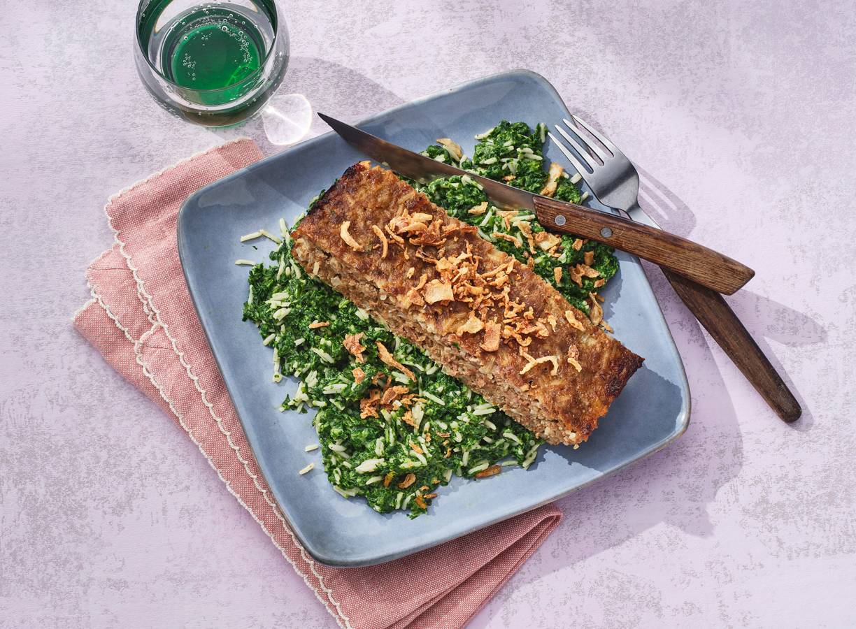 Gehaktbrood met rijst en spinazie