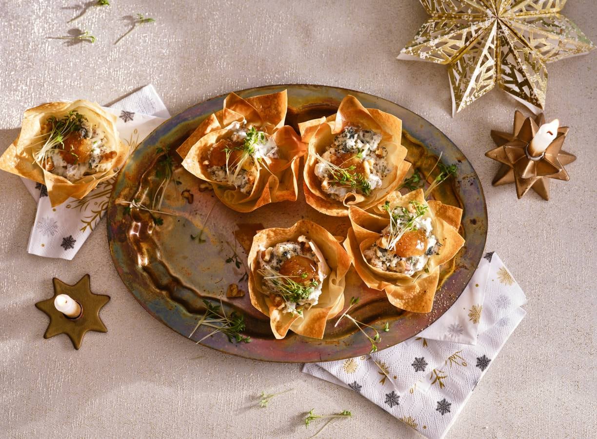 Chique en superlekker zijn deze filodeeghapjes met blauwe kaas, vijgenspread en tuinkers. Perfect voor de kerstborrel.