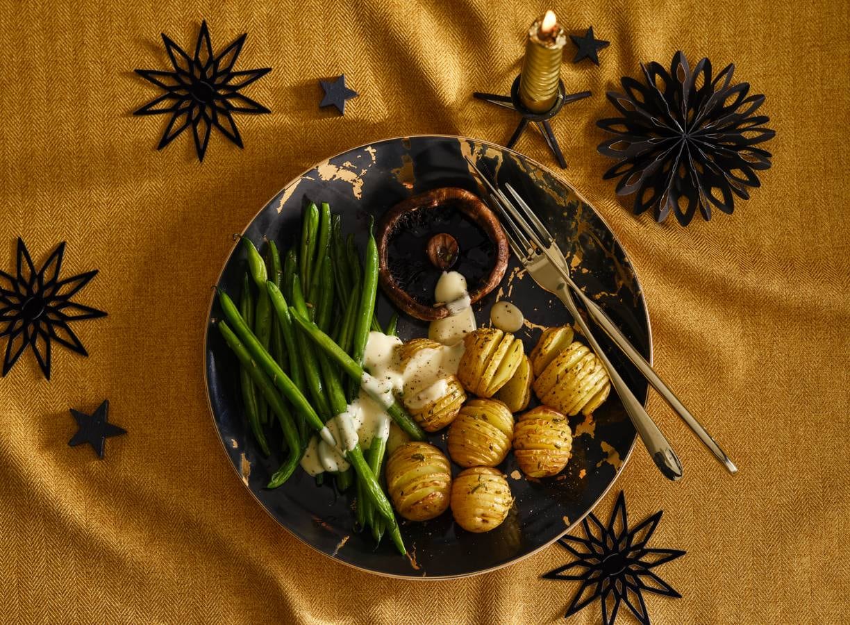 AVG'tje maar dan vegetarisch en extra feestelijk: portobello steak met groentesaus, sperziebonen en geroosterde hasselback krieltjes.