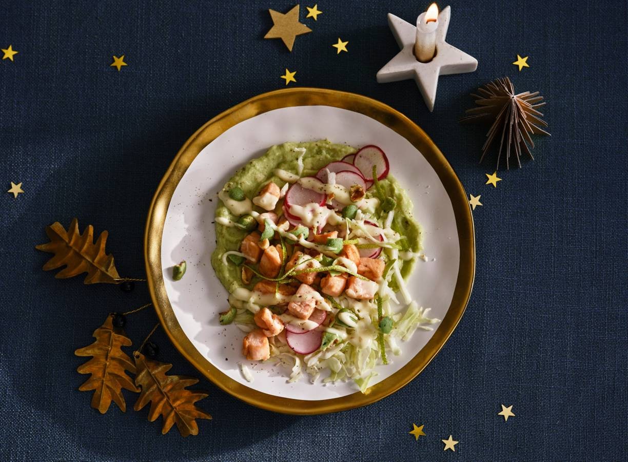 Een combinatie van smaken waar je u tegen zegt: avocadospread met zalm en sesammayodressing.