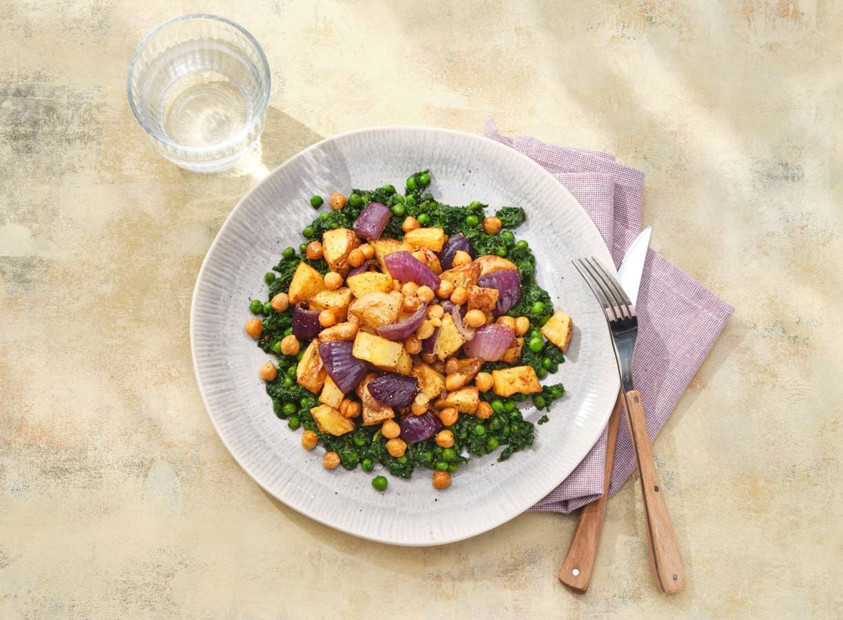 Kikkererwten en aardappel uit de oven met spinazie en tuinerwten