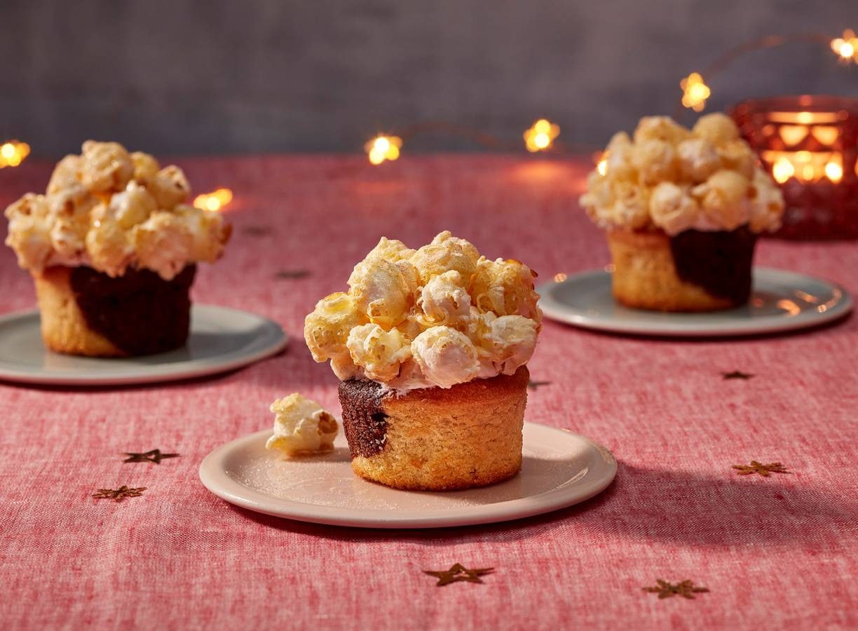 Kant en klare chocolade cupcakes met gouden popcorn