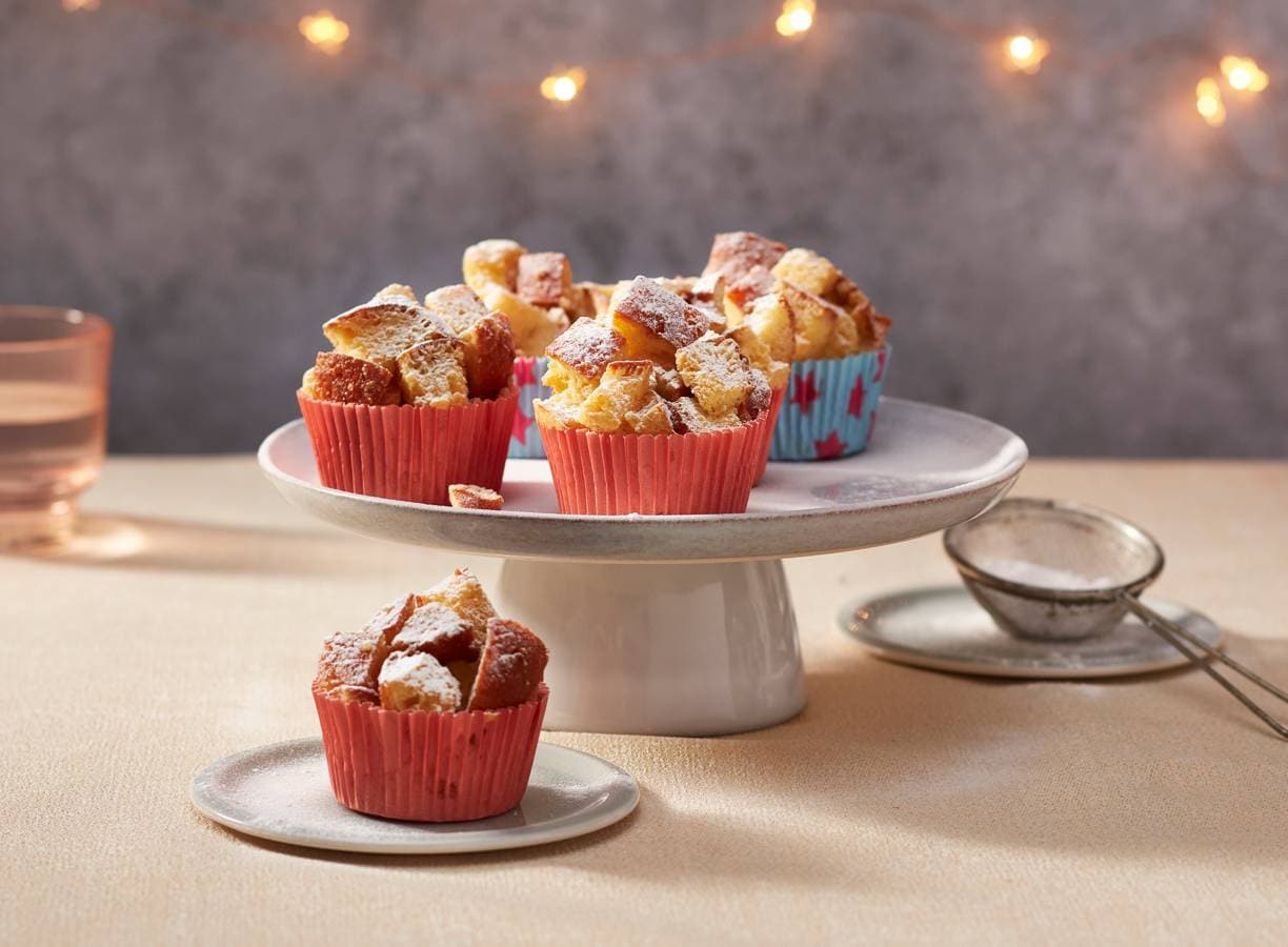Klop de eieren samen met de melk, kaneel en suiker los in een ruime kom. Voeg de stukjes oliebol toe, schep goed om tot alles bedekt is en verdeel over de muffinvorm.