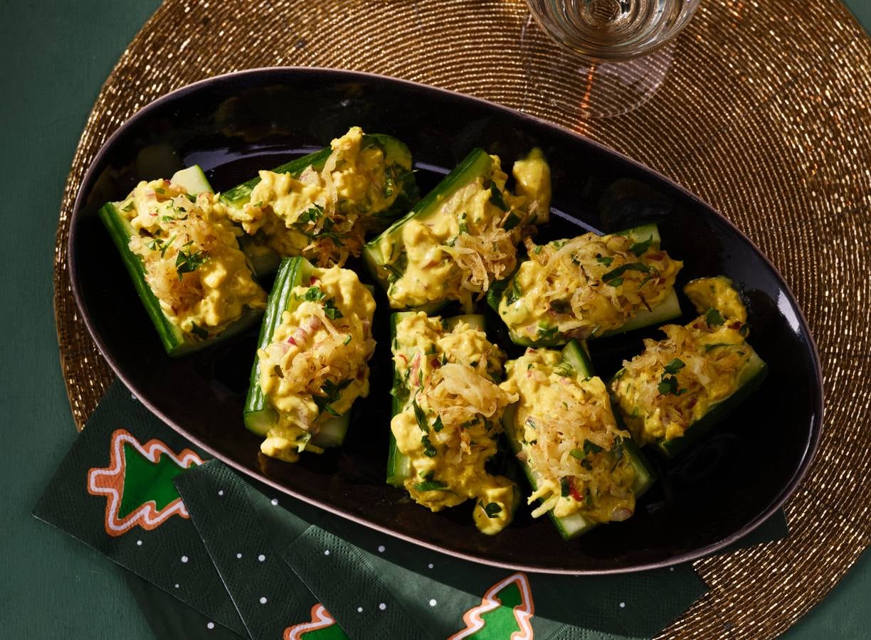 Vul de komkommerschuitjes met de kip-kerriesalade. Verdeel de gefrituurde aardappel erover en bestrooi met de rest van de peterselie.