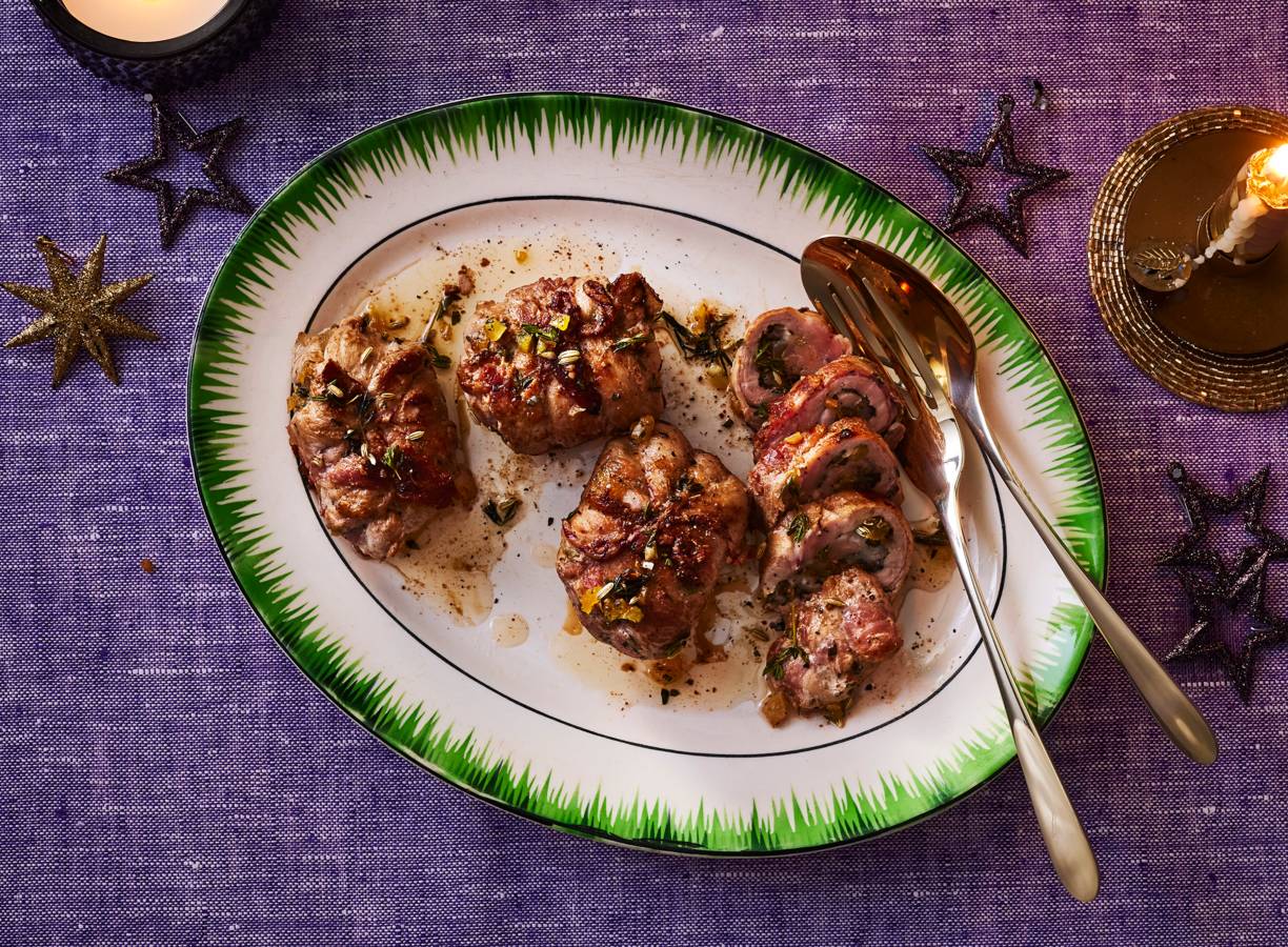 Shared dining heeft dit jaar ook z'n weg gevonden naar je kersttafel. En maar goed ook, want deze mini-varkensrollade met abrikozen en Italiaanse kruiden wil je met iedereen die je lief is delen.