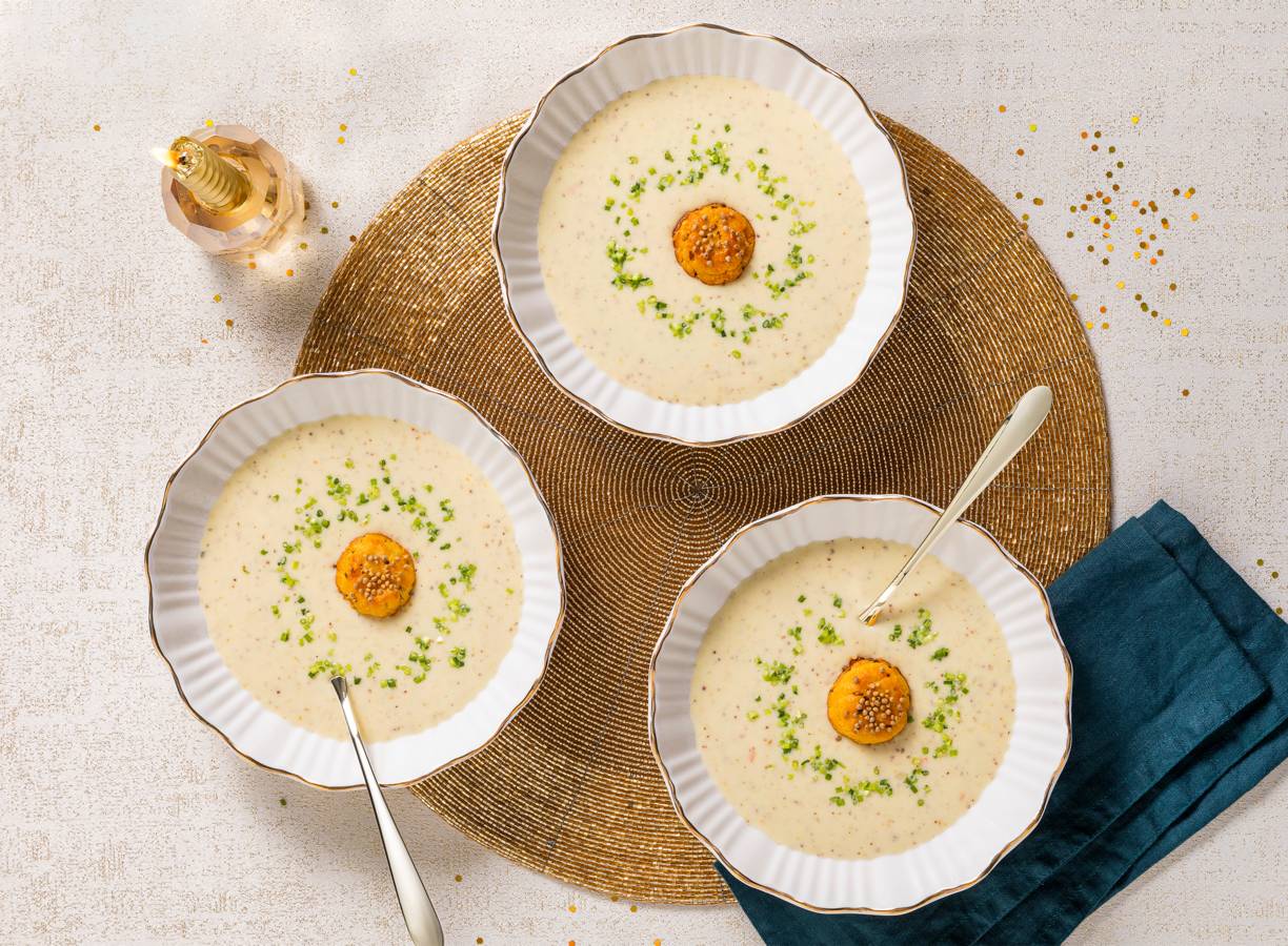 Een feestje op zich, dit tussengerecht van romige mosterdsoep. Maar wat ’m nog feestelijker maakt zijn de kaassoesjes met bieslook en cheddar. Handig: zowel de soep als de soesjes kun je ruim van tevoren maken.