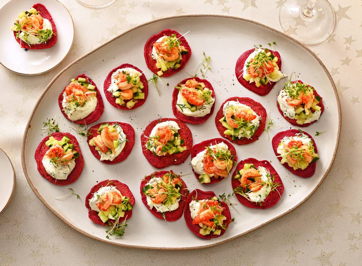 Als dit geen goed begin van het kerstdiner is! Het prachtige rood van de blini’s zelf, het beleg met dilleroom, komkommerpickle en rivierkreeftjes. Toch liever een vegan twist? Kijk maar bij de tips onder het recept!