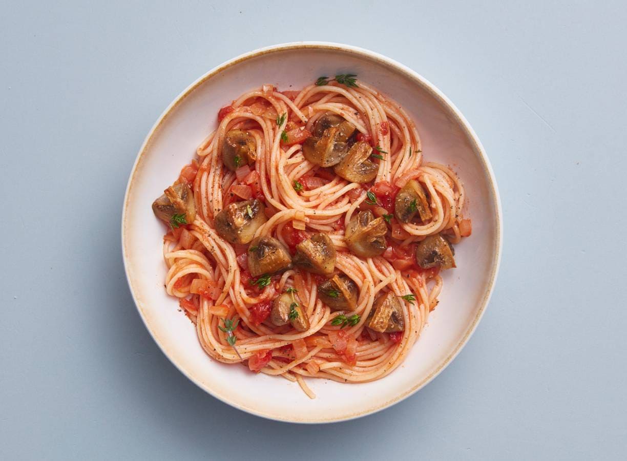 Geef spaghetti met rode saus wat extra smaak en textuur met champignons.