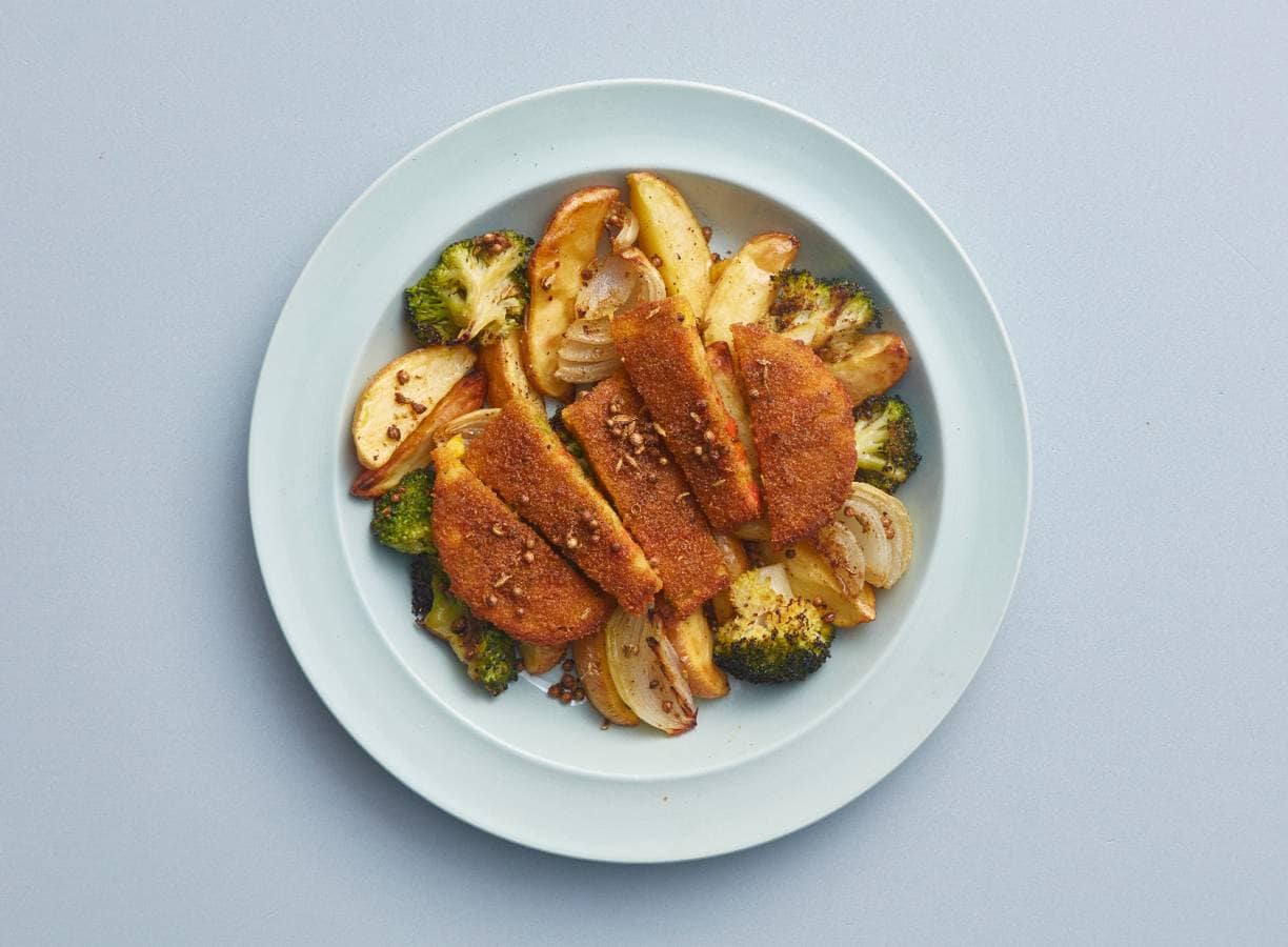 5 ingrediënten en vega? Deze aardappel-broccoli traybake met vegaburger is je nieuwe favoriet voor werkdagen.