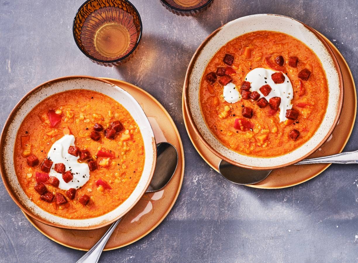 vegantip:Laat voor een vegan soep de chorizo achterwege en gebruik 3 el milde olijfolie extra. Voeg bij stap 3 1 tl gerooktepaprikapoeder toe. Vervang het kippenbouillonblokje door een groentebouillonblokje en de yoghurt door 8 el ongezoete plantaardige variatie op yoghurt.