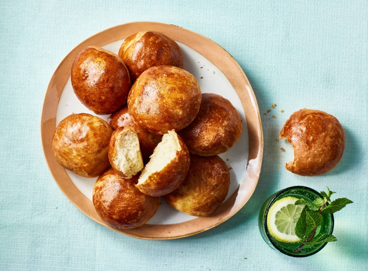 Verwarm ondertussen de oven voor op 190 °C. Splits het andere ei, het eiwit gebruik je niet. Bestrijk de gerezen bolletjes met het eigeel en bak ze in het midden van de oven in 15-18 min. lichtbruin. Laat minimaal 1 uur afkoelen.