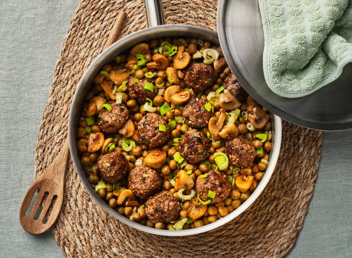 Voeg de balletjes met de rest van de olie toe aan de champignons in de hapjespan en bak in 5 min. rondom bruin. Zet het vuur middelhoog, voeg de prei en de rest van de knoflook toe en bak 6 min. mee. Schep regelmatig om.
