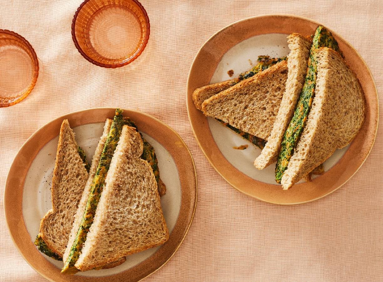 Beleg 4 sneetjes brood met een omelet en leg de rest van de sneetjes brood erop. Snijd de sandwiches diagonaal door en serveer direct.