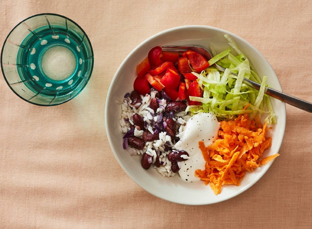 Schep het bonen-rijstmengsel, de winterpeen, paprika en ijsbergsla naast elkaar in diepe borden. Verdeel de yoghurt erover.