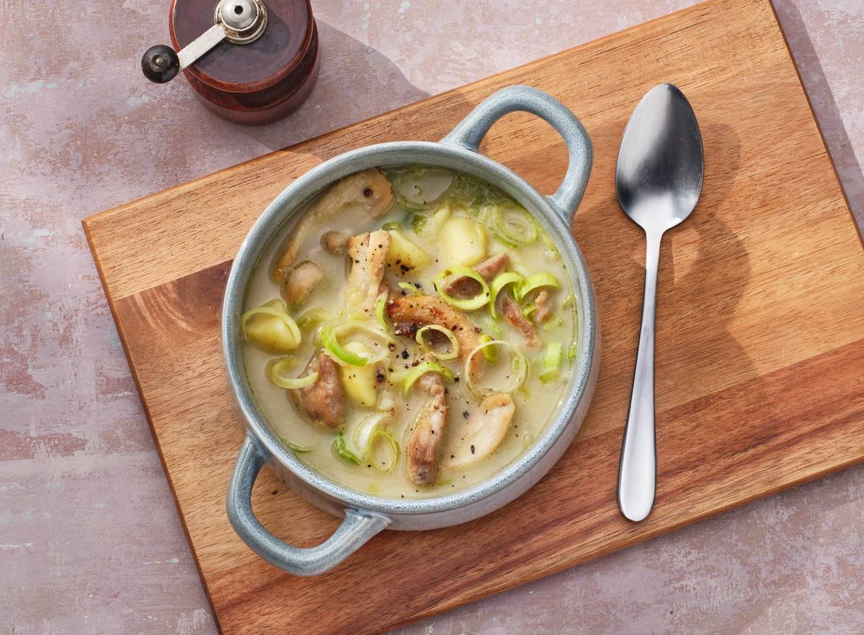 Geen heldere, maar romige kippensoep dankzij slagroom. Extra vullend met prei en aardappel. Daar knap je gegarandeerd van op!