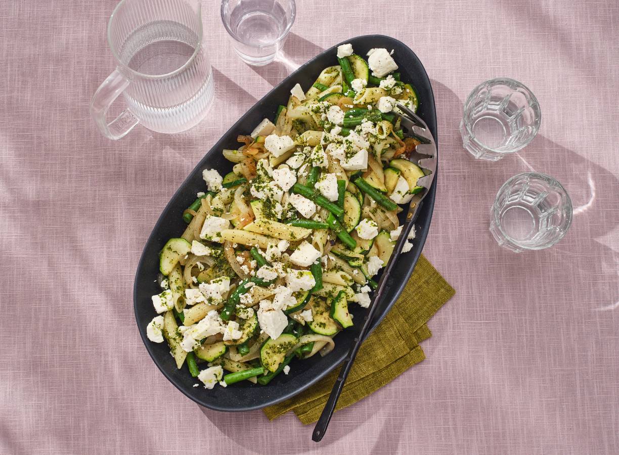 Welk seizoen het ook is: pastasalade kan altijd. Deze vega salade maak je met courgette, sperziebonen en witte kaas.