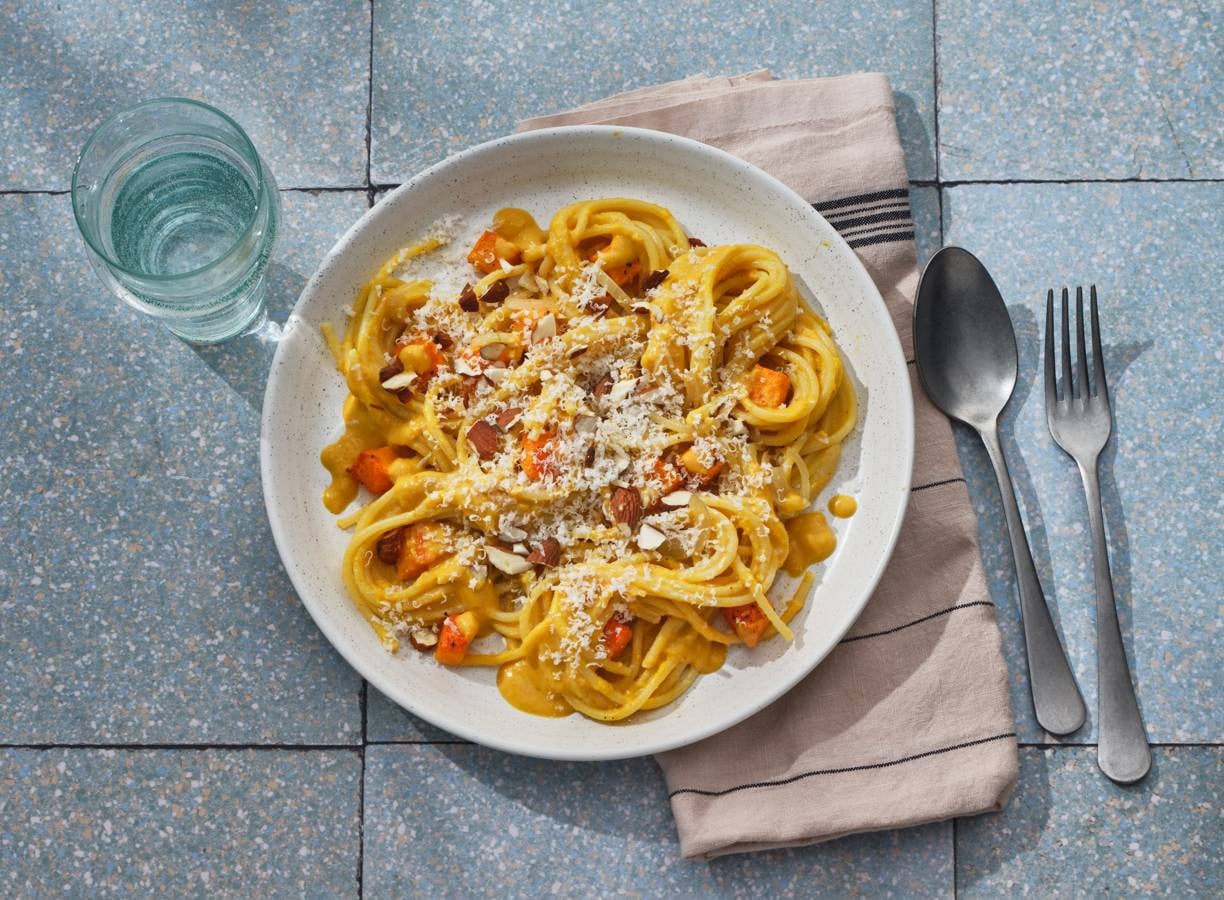 Spaghetti met geroosterde pompoen en blauwe kaas