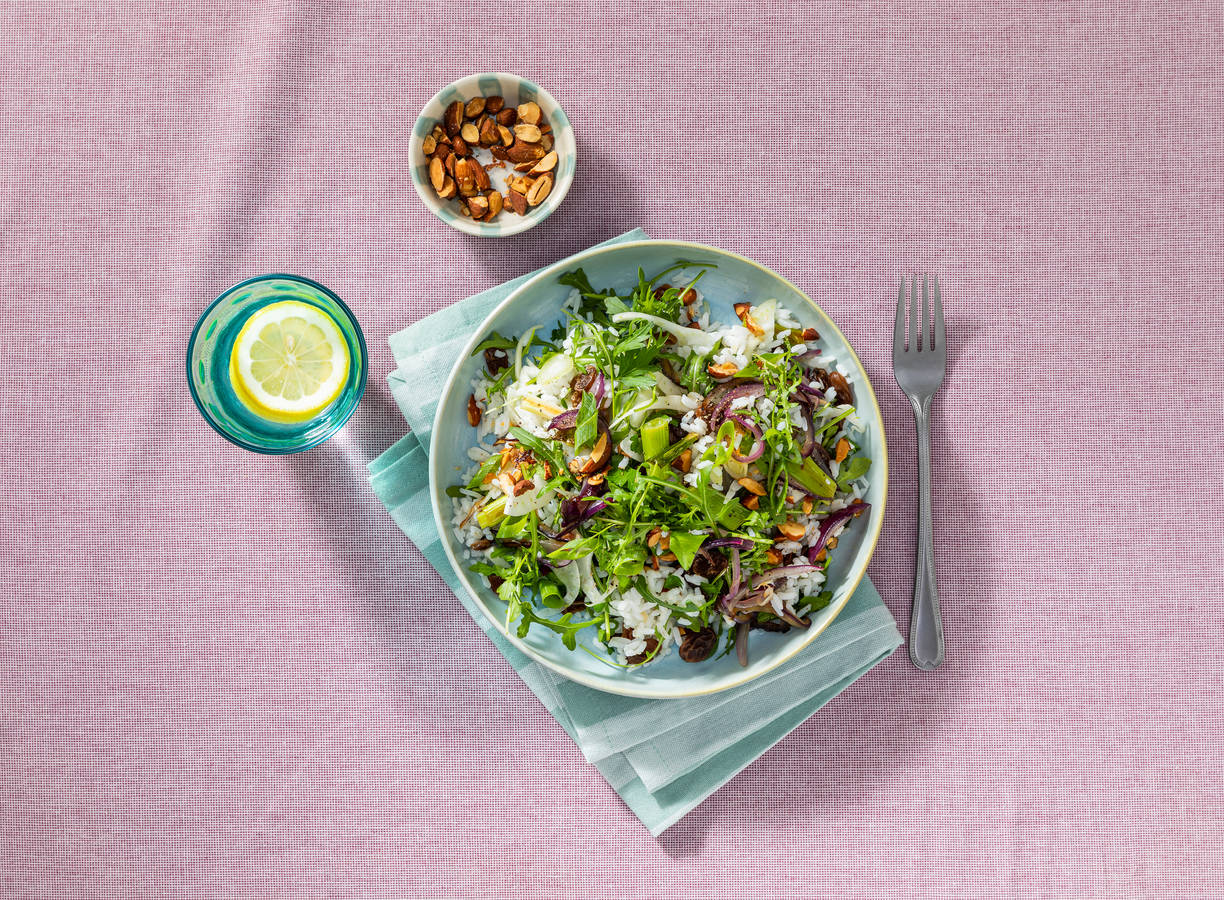 Rijst in huis? Maak er salade van! Deze rijstsalade met venkel, bosui, rozijnen, amandelen en rucola zit boordevol smaakmakers. Peterselie en appelciderazijn erover en klaar is je kleurrijke bord.