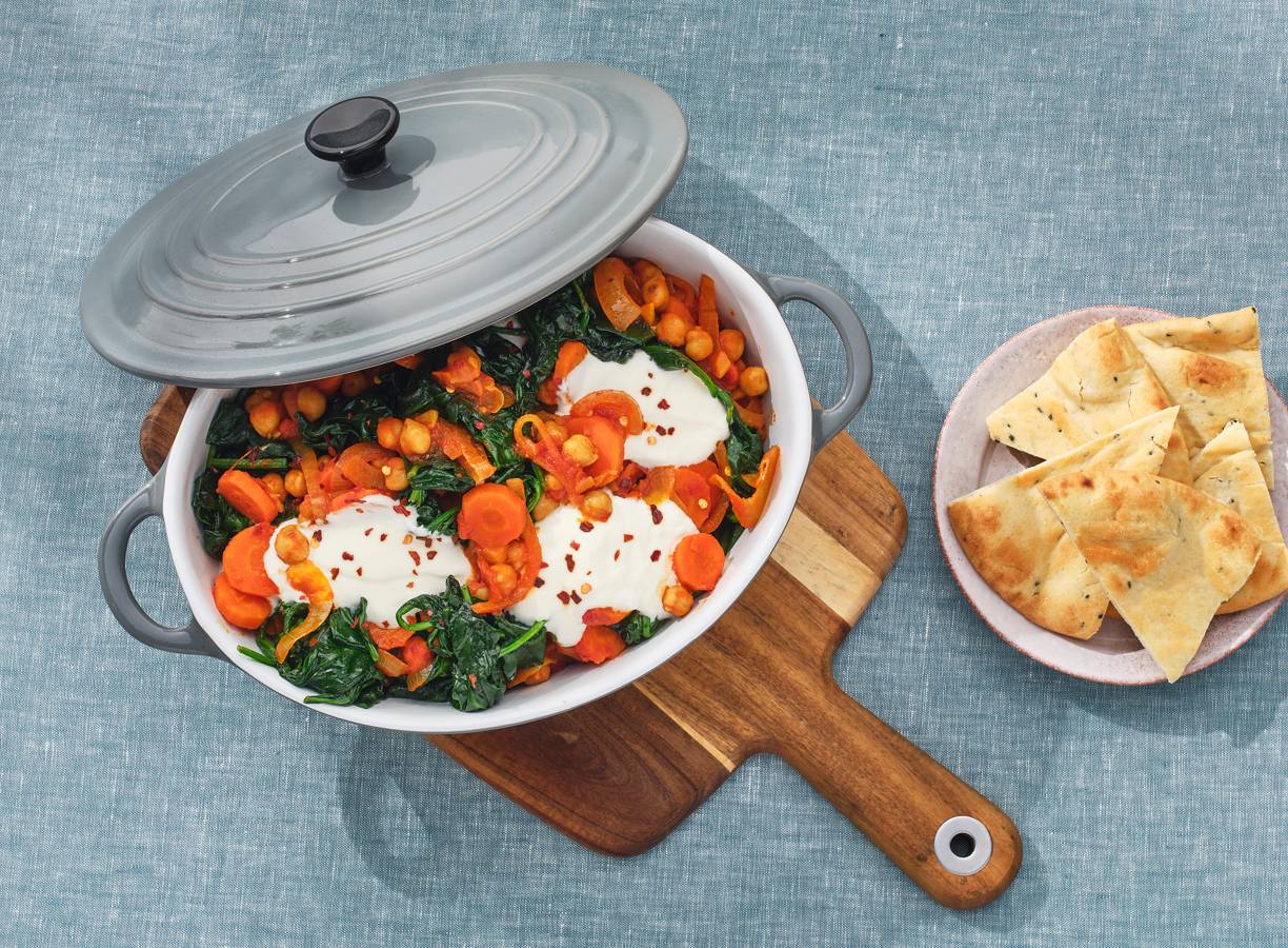 Roer de spinazie in delen door de kikkererwtenstoof. Breng op smaak met peper en eventueel zout. Verdeel de kikkererwtenstoof over de borden. Serveer met de yoghurt en het brood.