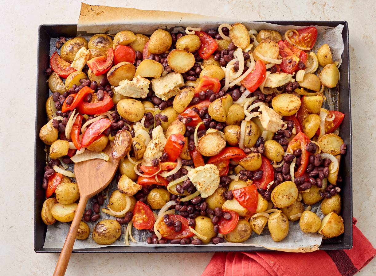 Traybake met krieltjes, zwarte bonen en witte kaas