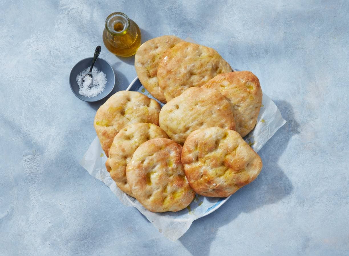 Plaats 4 broodjes op het bakpapier op de hete bakplaat. Bak de focaccia’s in ca. 12-15 min. lichtbruin en gaar. Herhaal met de andere broodjes.