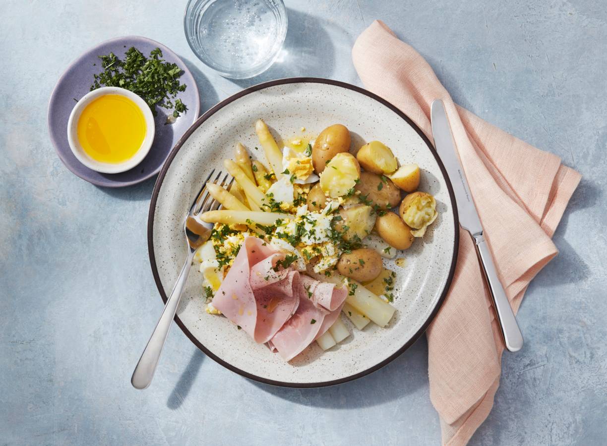 Giet de asperges en krieltjes af en verdeel ze over de borden. Verdeel achtereenvolgend het geprakte ei, de gesmolten boter en peterselie over de asperges. Verdeel de ham in mooie roosjes en leg ze ernaast.
